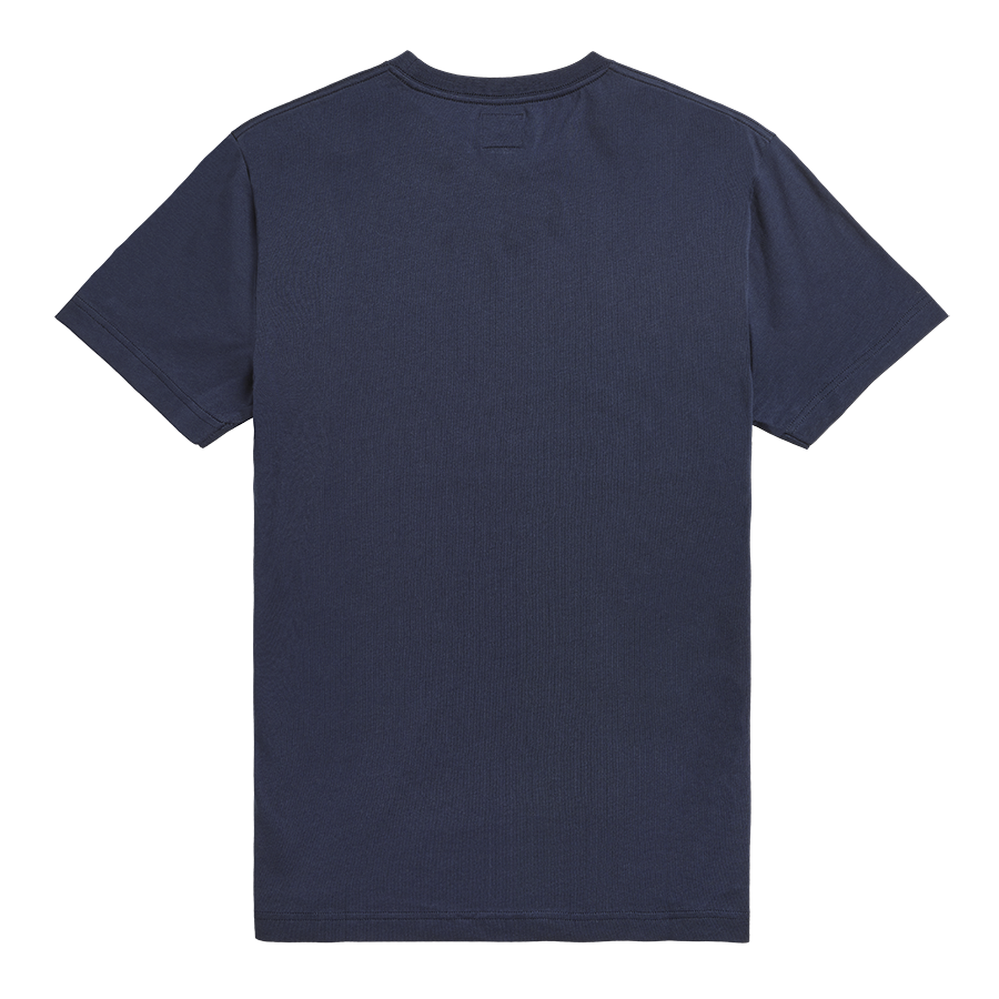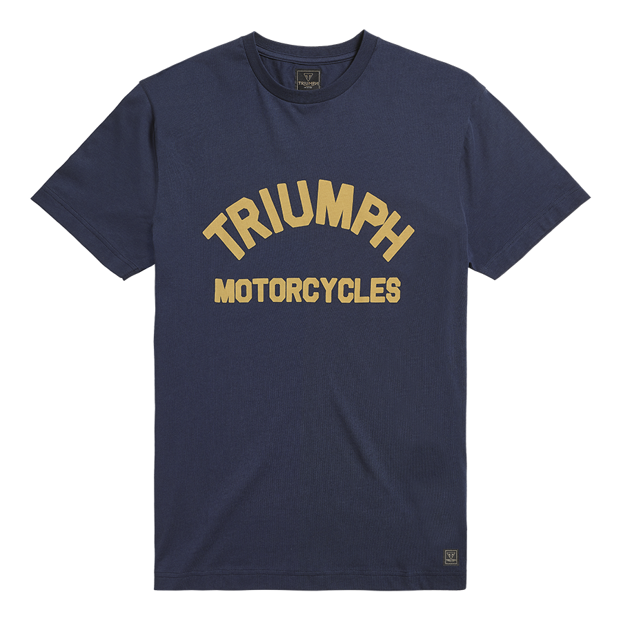 A Navy 160g weight cotton tee with stylised soft pigment arched Triumph Motorcycles lettering in Dull Gold on the chest, and new signature Triumph-branded woven badge towards the lower hem.